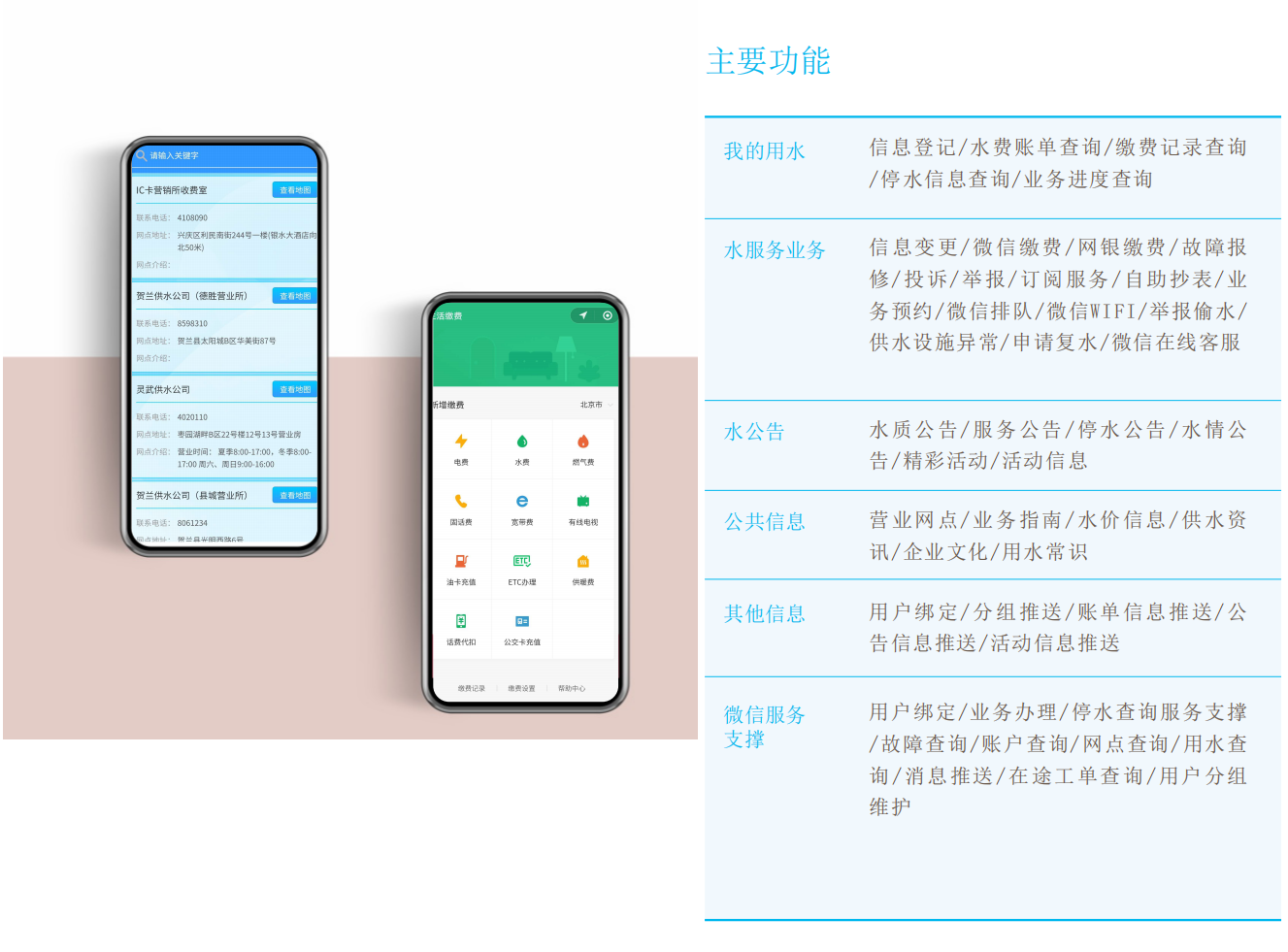 微信公众平台实现与GIS、营业收费系统、报装业务系统、供水热线服务等系统的集成,为用户提供丰富和实时的服务和营收业务内容。
