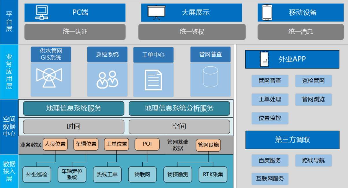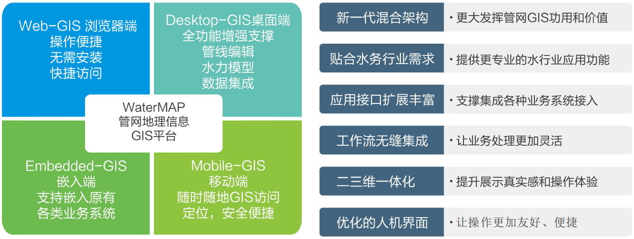 系统结合二三维一体化技术、互联网技术和大数据挖掘技术等,实现了管网空间数据和属性数据的录入、编辑;对管线及各种设施进行属性查询、空间定位以及定性、定量的统计、分析;对各类图形(包括管线的横断面图和纵断面图)及统计分析报表显示和输出;为爆管、漏水事故的抢修、维修提供关闸方案,派工单及用户停水通知单,从而实现管网的信息化管理,对供水规划、设计、调度、抢修和图籍资料的档案管理提供强有力的科学决策依据,并为管网的优化调度奠定良好的基础,从而大大提高了管网管理工作的效率和质量。