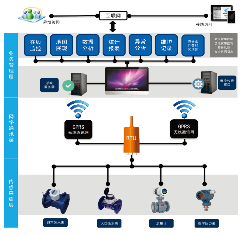 大用户监控系统主要是对大用户的流量及压力情况进行监控,实时采集相关的流量及压力信息数据并进行统计分析,用于对大用户用水情况监督并指导水司生产运行。